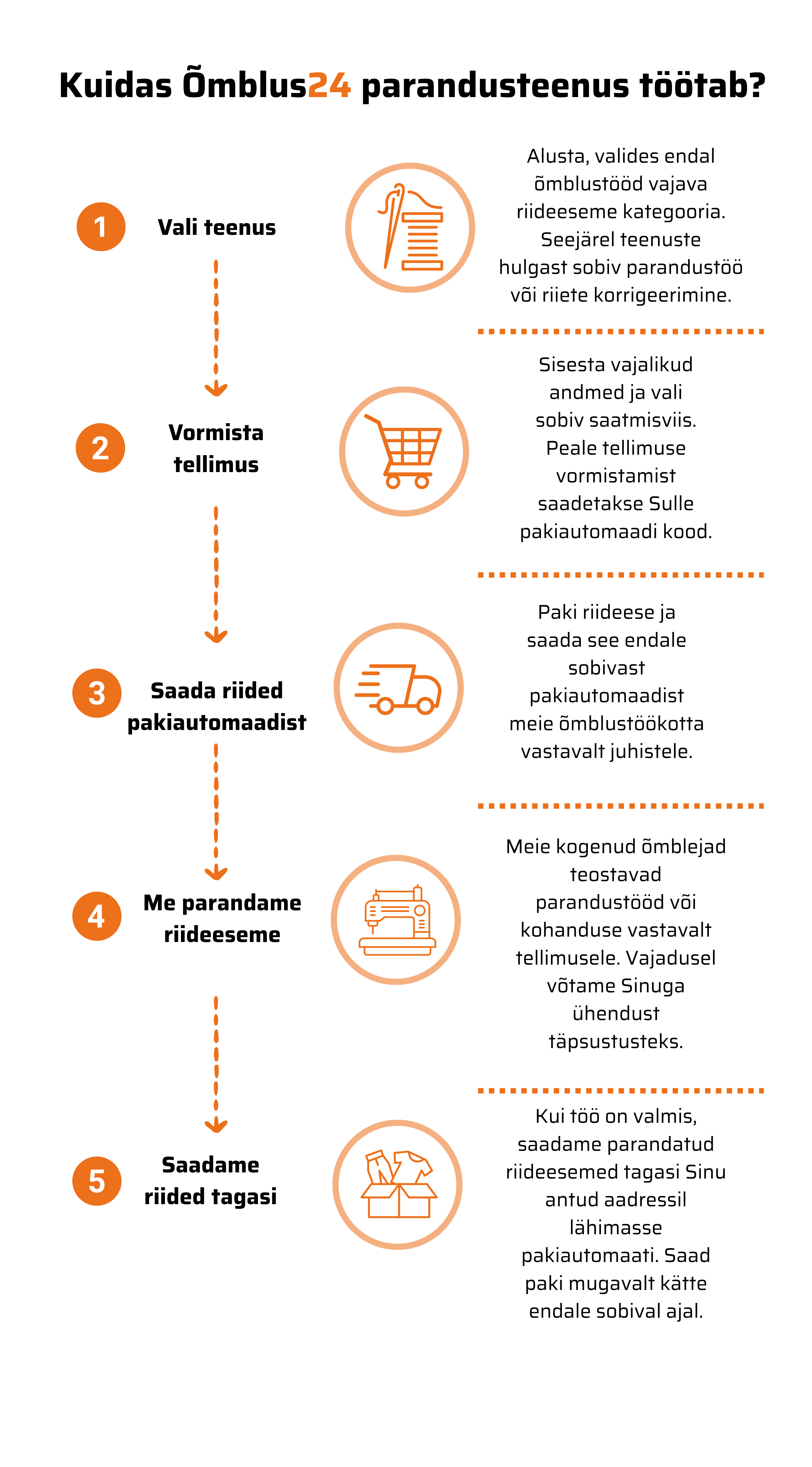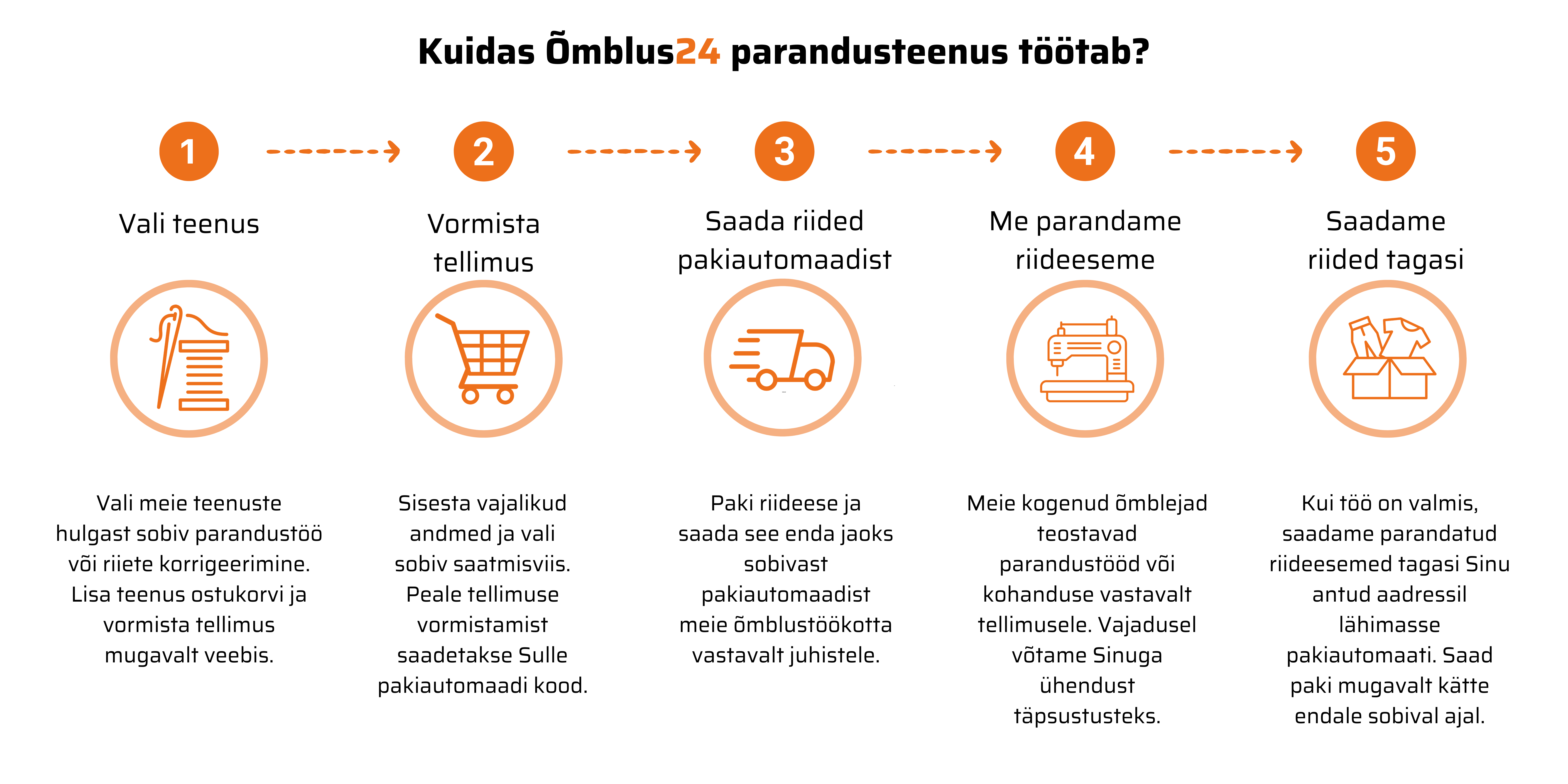 Õmblus24 pakub mugavat ja kvaliteetset õmblus- ning parandusteenust üle Eesti. Vali meie e-poes oma rõivaese, märgi soovitud parandustöö ning vormista tellimus vaid mõne klikiga. Saada rõivas meile pakiautomaadi kaudu ja meie hoolitseme professionaalse teostuse eest.